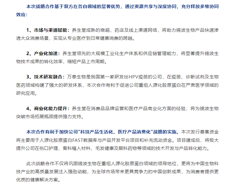 从上述分析来看,养生堂或者说钟睒睒确实需要找到新的业务增长路径。而从业务协同的角度来看,入股锦波生物也有望产生业务协同效应。锦波生物微信公众号显示,本次合作有利于加快公司“科技产品生活化、医疗产品消费化”战略的实施,并从市场与渠道赋能、产业化加速、技术研发融合和商业化能力提升这四个方面进行了分析。