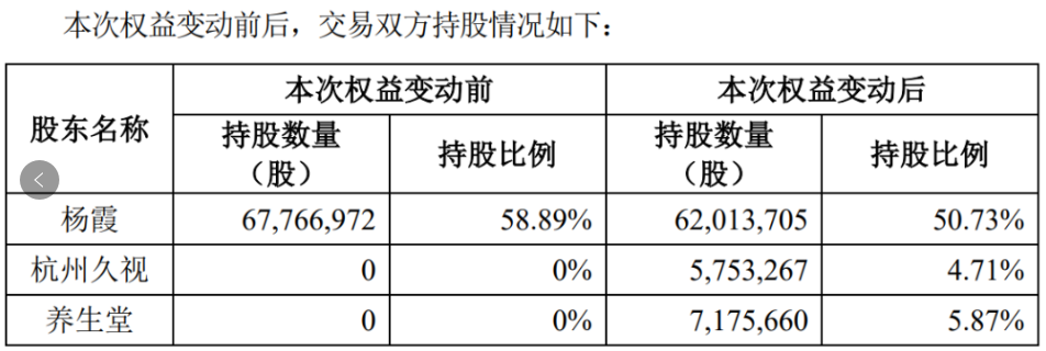 此外,杨霞与杭州久视签署了《股份转让协议》。杨霞将其持有的上市公司575.33万股无限售条件流通股(占签署日上市公司股本总额的5%),连同与之相关的全部权利义务协议转让给杭州久视,转让价格为243.84元/股(含税),共计14.03亿元。目前,养生堂持有杭州久视99.75%股份。也就是说,如果定增方案获得监管部门批准,通过此次权益变动,钟睒睒将通过旗下两家公司持有锦波生物10.58%股份。